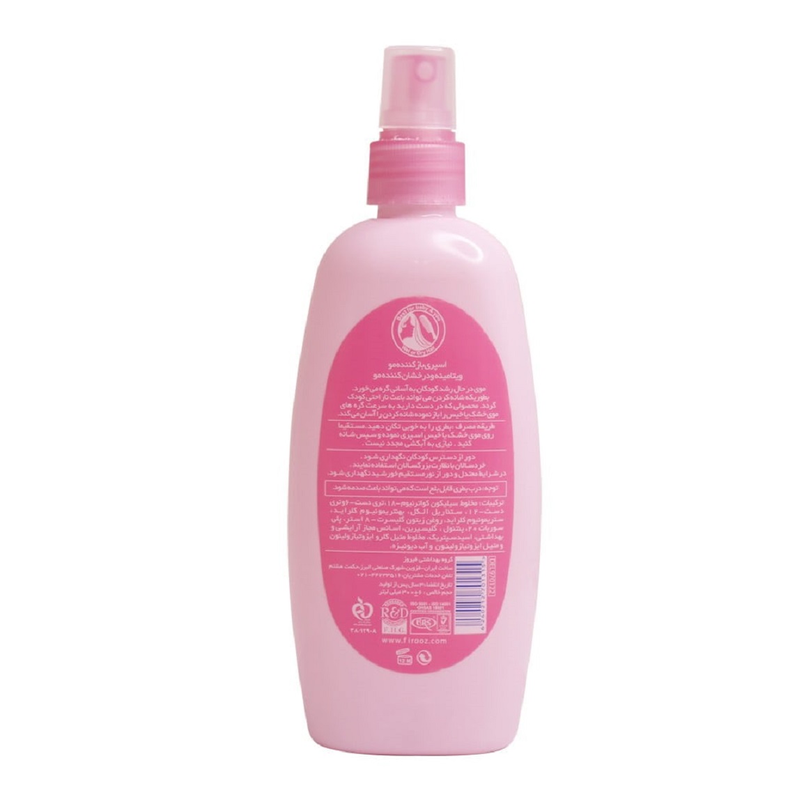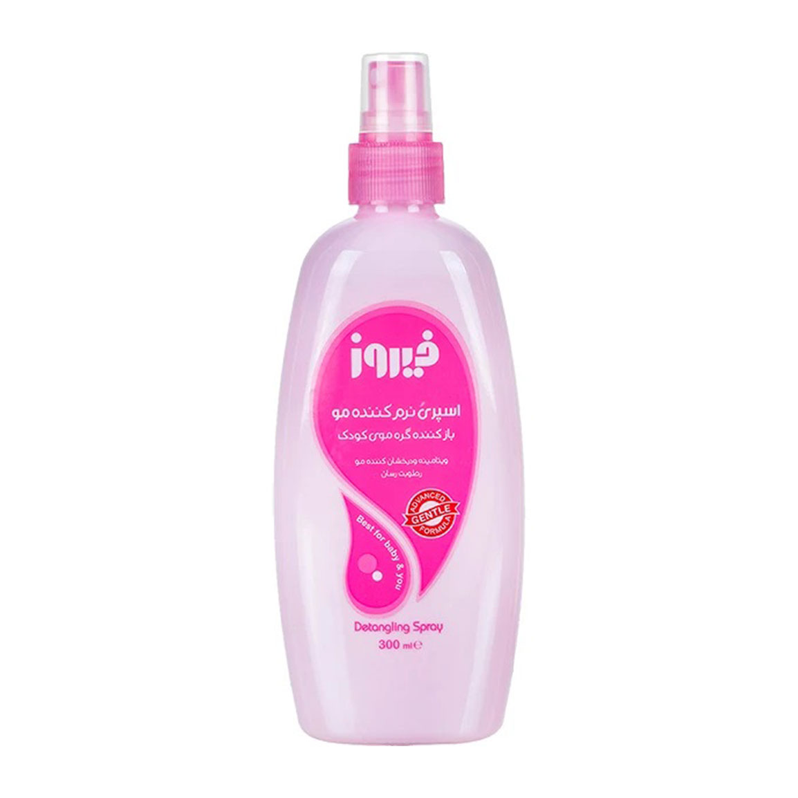 اسپری نرم کننده و باز کننده گره مو کودک فیروز استحکام بخش و ضد شکنندگی موی کودکان است. موی کودکان به دلیل نرمی و لطافتی که دارند در معرض گره خوردگی مداوم هستند این محصول به دلیل ترکیباتی که دارد تا حد امکان از گره خوردن موی کودکان جلوگیری به عمل میآورد. لازم به ذکر است اسپریهای ضد گره برای موهای خشک و نم دار قابل استفاده هستند، بهتر است در زمانی که موهایتان خیس است از اسپری استفاده نکنید زیرا این ماده روی موها سر میخورد و از بین میرود.